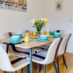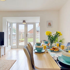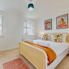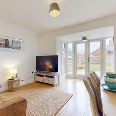 On the ground floor, enjoy a bright open-plan kitchen/dining area with double doors opening to the patio and garden. The kitchen is fully equipped with kettle, toaster, microwave, oven, hob, fridge-freezer, cooking utensils, and tableware. Also on this floor: a separate study with desk, a utility closet (washing machine, ironing facilities, hoover, cleaning products), a WC and plenty of storage under the stairs makining it perfect for leisure travel, contractors and insurance claims.